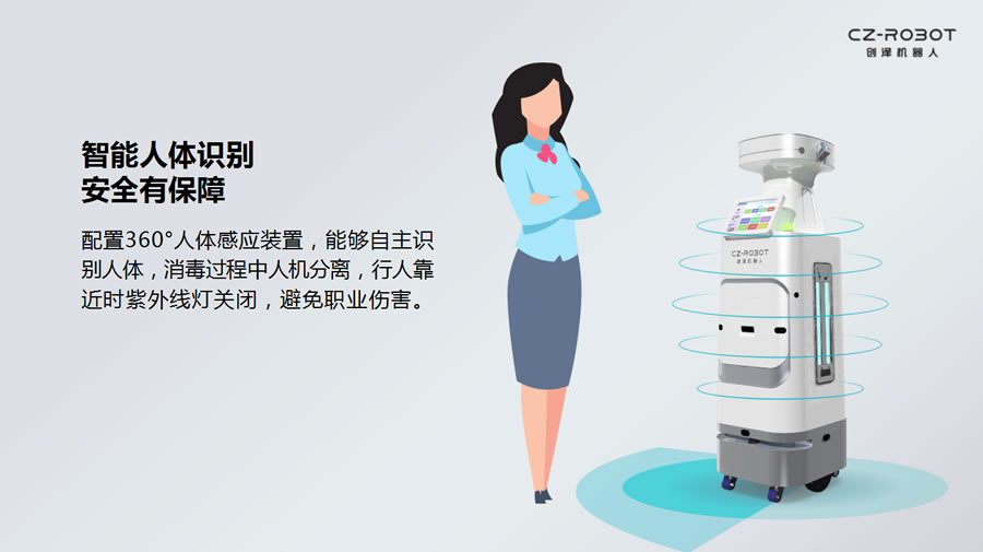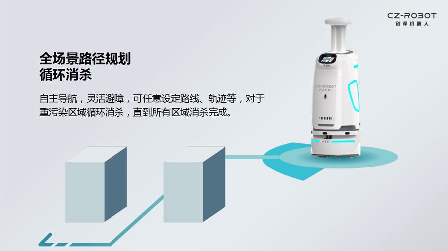 消毒机器人在疫情现场,重点针对患者、医护、医废的G频活动区域进行沿路经自动G水平消毒,重点针对患者和医护人员的所处区域进行多点终末消毒。
