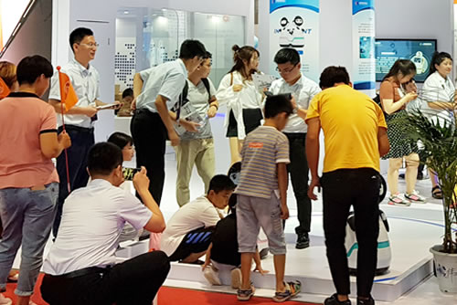 智能语音对话机器人正在展会上和小朋友对话互动呢,这是机器人展会现场,小朋友和机器人都很认真对话交流呢...