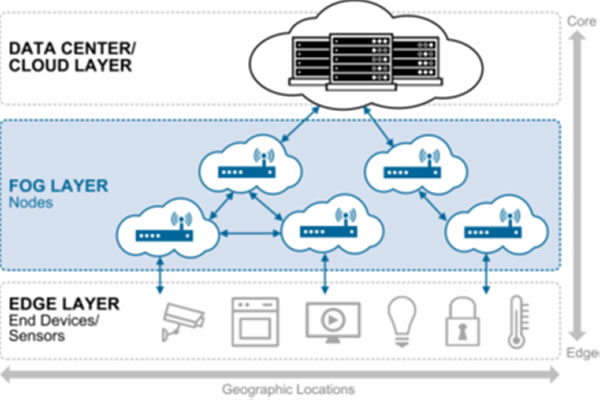 雾计算是一种新兴的计算范式,它使计算、存储、网络、加速、分析和管理控制更接近于网络的边缘。它的名字来源于这样一个事实:云在GG的天空,雾则离地面更近。雾计算的关键是,云(或核心中的企业服务器)与物联网设备之间包含一个雾层,如图1所示。来自物联网设备的事件被发送到靠近网络边缘的雾节点。