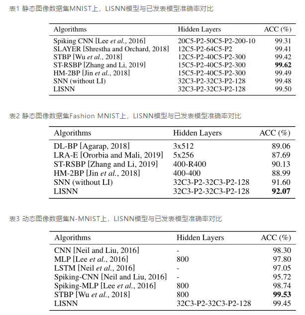 该研究工作分别在静态数据集MNIST与Fashion MNIST、动态数据集N-MNIST上对LISNN的性能进行了验证。输入数据以特定方式编码为一定长度的脉冲序列,每个时刻的序列规模与原图像(或事件点坐标范围)相同。模型在MNIST和N-MNIST数据集上均取得了和已有好性能相近的结果;在Fashion-MNIST数据集上则取得了SNN中的好性能。本模型与已发表模型的性能对比见表1-3。