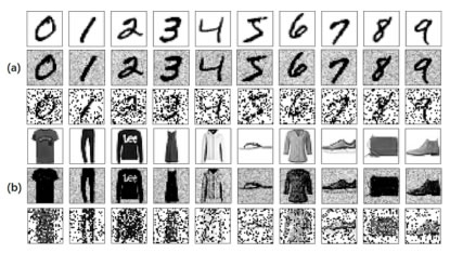 (b)三行依次为原始Fashion MNIST测试集图片、加入G斯噪声后的图片、加入脉冲噪声后的图片