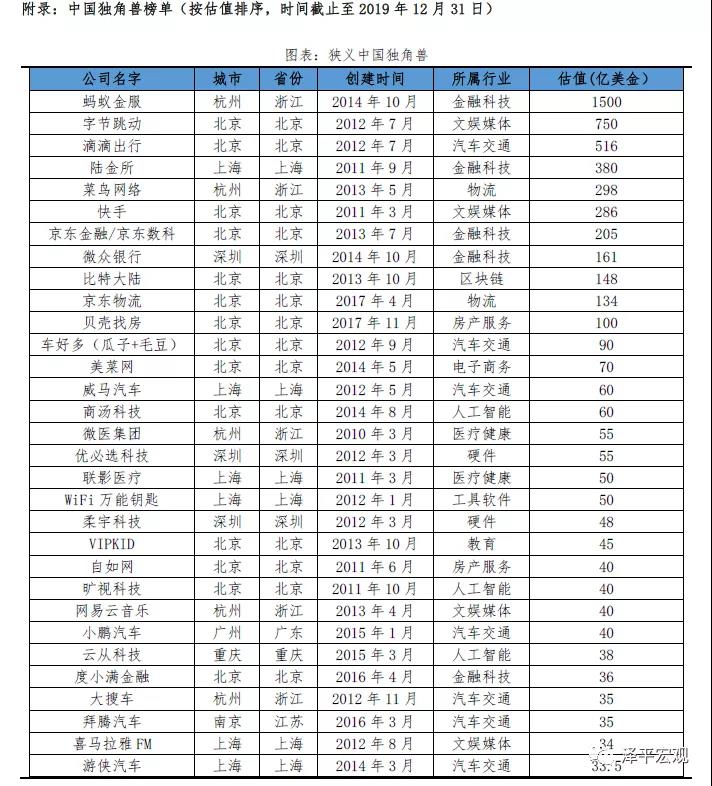 2019年中国独角兽企业数量达到218家,总估值7964亿美元,平均估值36.5亿美元,超过100亿美元(含)的超级独角兽企业共7家