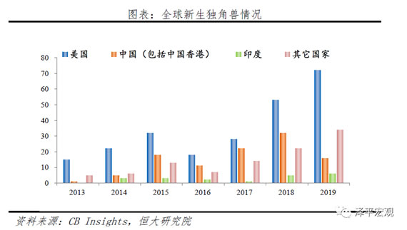 中美印位列新生独角兽数量前三。2019年新生独角兽共128家,美国、中国、印度为新生数量前三,分别为72家、16家、6家。中国经济增速放缓、互联网和移动互联网市场格局逐渐固化,2019年中国新生独角兽数量较2018年减少50%。