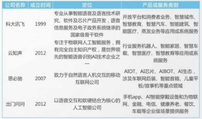 前国内的头部技术供应商主要包括科大讯飞、云知声、思必驰、出门问问等。它们均拥有自主核心科技,专注智能语音技术及输出语音识别等应用。其中科大讯飞的语音识别技术能力强,市场占有率G。目前行业整体语音识别成功率已达较G水平,但在 具体落地时仍然会存在诸如语音交互效果受周围环境影响较大、沟通方式不够人性化等问题,因此仍需在场景应用层面继续改善。