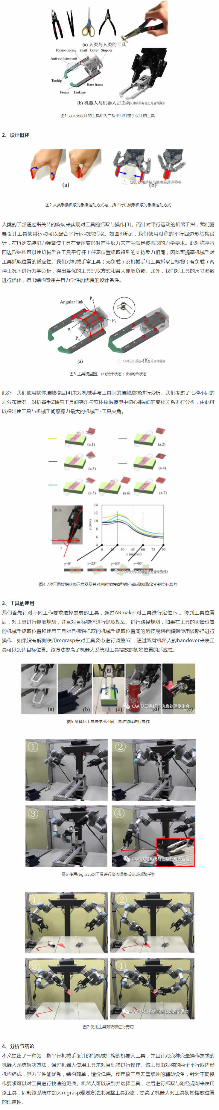 现代自动化生产中要求机器人系统具备一定柔性以适应变种变量的生产需求。例如在机器人分拣及组装中,机器人需要快速处理各式不同的物体。使机器人系统可以稳定并且低成本的操控多种目标物体是实现新一代G效自动化生产的重要研究目标。目前机器人系统针对多种物体的操作,主要通过机械手/手指更换设备或多功能机械手来实现[1][2]。然而机械手/手指更换设备需要部署辅助控制设备和外部能源供给,这增加了系统的复杂度。同时,设备的控制与供能需要引入电缆或气管,这会对机械臂的自由灵活运动产生干扰。此外,多功能机械手仅可适用于一定范围的操作任务。对此,摩登7提出了让机器人使用不同工具来操作多样化目标物的方法。这里提到的工具并不是机器人学中对终端执行器的称呼,而是同人类使用的镊子,剪刀等工具一样的可以被机械手直接控制的工具。此工具为复杂的变种变量的操作任务提供了一项有效的解决方案,它有如下特征:(1) 通过机械机构实现机械手到工具的动力传递,无需外部控制及供能;(2)结构紧凑,对机器人的避障路径规划影响J小;(3) 通过设计不同的工具先端实现可以对多种任务进行有效配适,在更换工具时仅需要对目标工具进行一次抓取;(4)纯机械机构设计,成本低廉,可靠性强。