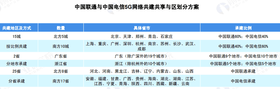 联通运营公司将独立承建广东省的9个地市、浙江省的5个地市以及前述地区之外的北方8省(河北、河南、黑龙江、吉林、辽宁、内 蒙古、山东、山西);中国电信将独立承建广东省的10个地市、浙江省的5个地市以及前述地区之外的南方17省。
