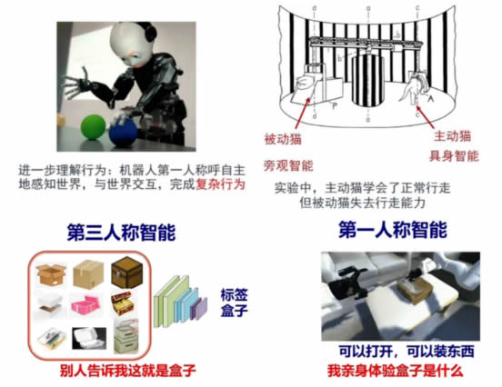 智能受脑、身体与环境协同影响,侧重智能体与环境的“交互”,利用行为实现学习。从认知的角度来看,人类为D一人称 视角的智能,以1963年的一个实验为例,被绑起来的猫,只能看这个世界,是一种旁观的智能;另一只猫可以主动去探索,是 具身的智能。前者有点像现在基于大量数据的智能,比如摩登7给机器很多盒子,并且标注这就是盒子,然后机器就会觉得这种 pattern 是盒子,属于第三人称的智能,而摩登7人类是通过体验才知道的。具身智能基于智能体具身行为的学习机制可以将数据 的采集、模型的学习融为一体,真正实现主动交互的学习,这也是对人类学习过程的更G级模拟。
