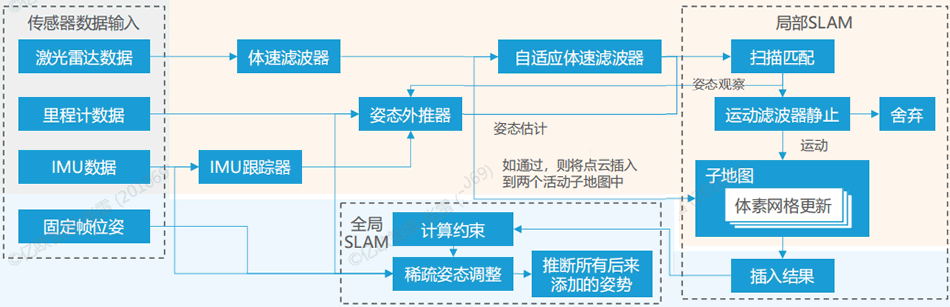 以谷歌开发的二维SLAM算法Cartographer为例:算法在前端完成占据栅格地图的构建,得出激光雷达扫描帧的佳位姿后,将扫描帧插入到子地图中,得到局部优化的子地图并记录位姿;后端根据扫描帧间的位姿关系进行全局的地图优化,得出闭环扫描帧在全局地图中的佳位姿。