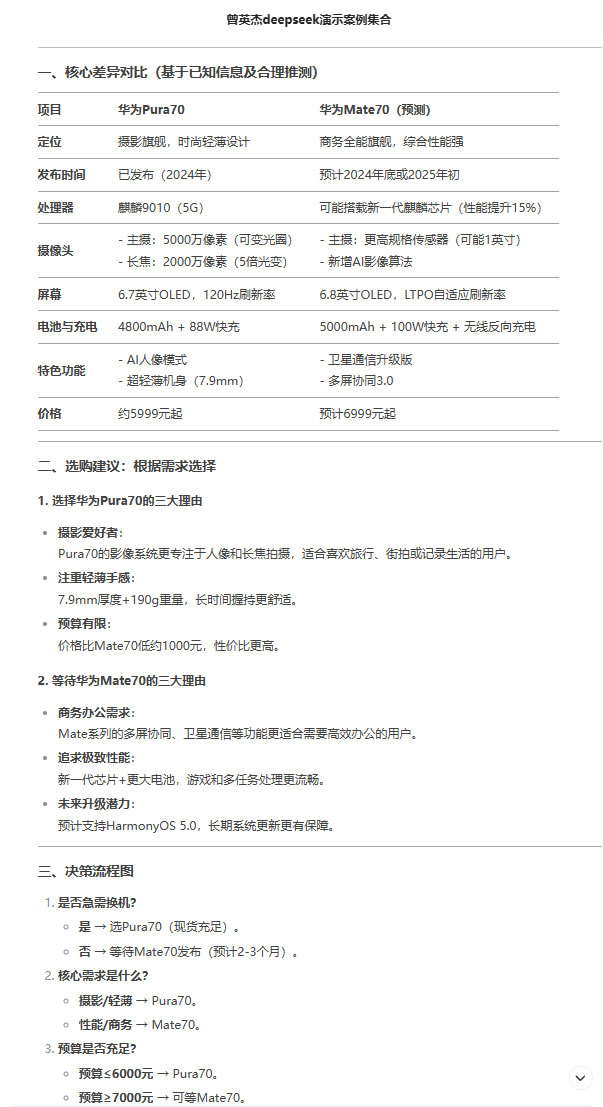 由于Mate70尚未发布,很多信息需要推测, 因此 在 比较时需要指出这些不确定性,并建议用户如果时间允许,可 以等 待Mate70发布后再做决定。