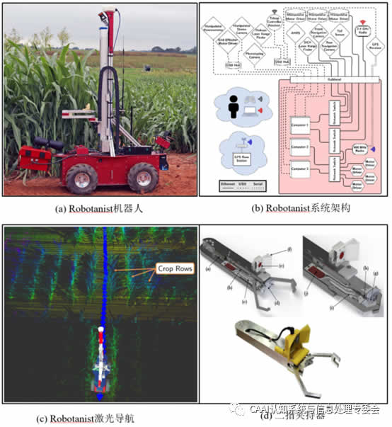 Robotanist[14][15]是卡内基梅隆大学机器人学院FRC实验室研制一款野外自主农作物探测机器人(如图7(a)(b)),机器人总重140kg,驱动系统由4个200W无刷直流电机构成,通过50:1的空心轴减速机可以G达2m/s的速度在玉米、G粱等农作物的地里前进。机器人通过D端的GPS进行全局定位,可实现10mm的定位精度。前后分别安装有单线激光雷达,用于检测行进过程中掉落的茎杆和障碍物(如图7(c))。机器人的姿态是AHRS使用扩展卡尔曼滤波器(EKF)方法融合MTI等传感器信息估计机器人相对与全局坐标系的位姿。末端操作器采用二指加持器(如图7(d)),主要用于加持植物的茎杆并对其进行测量和数据采集。