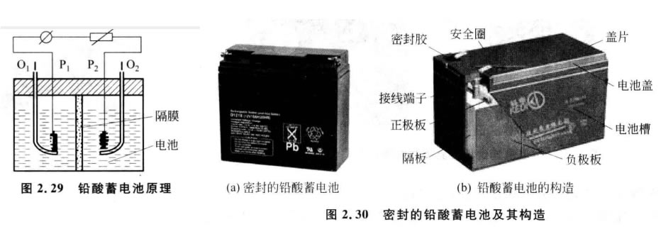 1859年,法国人普兰特发明了铅酸蓄电池,至今已有 150多年的发展历程。铅酸蓄电池在理论研究、产品种类 及品种、产品电气性能等方面都得到了长足的进步,在交 通、通信、电力、军事、航海、航空等各个领域,铅酸蓄电池都 起到了不可缺少的重要作用。铅酸蓄电池的原理和构造如 图2.29和图2.30所示,它是一种电极由铅及其氧化物制成,电解液是硫酸溶液的蓄电池。铅酸蓄电池在荷电状态下,正极的主要成分是二氧化 铅,负极主要成分为铅。在放电状态下,正负极的主要成分均为硫酸铅。