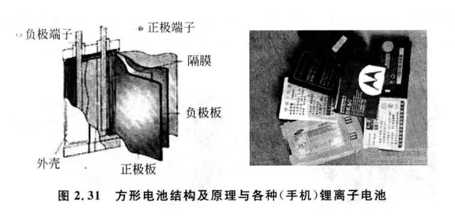 锂电池是指电化学体系中含有锂(包括金属锂、锂合金、锂离子、锂聚合物),由锂金 属或锂合金为负极材料、使用非水电解质溶液的电池。锂电池大致分为锂金属电池和锂 离子电池两类。锂金属电池内含金属态锂,它通常是不可充电的。锂离子电池不含有金 属态锂,它可以充电。Z早出现的锂电池来自于伟大的发明家爱迪生,他使用了反应 Li+MnO₂=LiMnO₂ 。 该反应为氧化还原反应和放电。由于锂金属的化学特性非常活 泼,使得锂金属的加工和保存及使用对环境要求非常高,所以锂电池长期没有得到广泛 应用。但是,锂电池现在已经成为了主流,如图2.31所示。锂离子电池中因为不含有重 金属镉,与镍镉电池相比较,它可以大大减少对环境的污染。