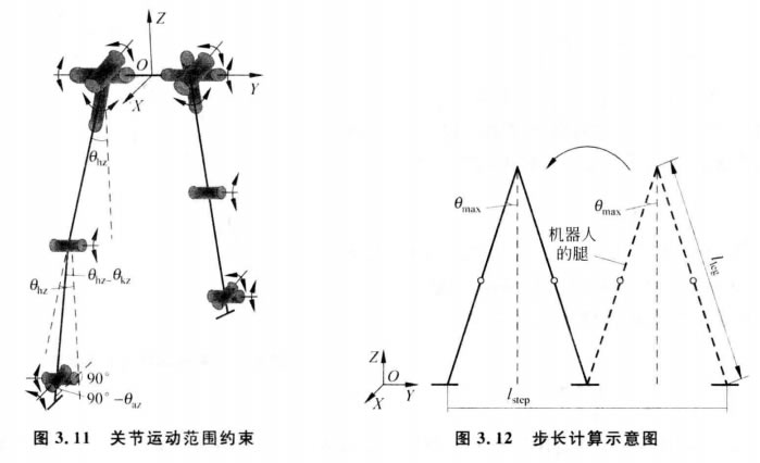 (1)运动范围约束。智能接待智能接待机器人各个关节都有其运动范围,需要对各个关节的运动 范围进行约束。为了使其能够更稳定地步行,要分别对智能接待智能接待机器人下肢12 DOF 的运动 和上体腰及手臂等7个关节的运动进行约束。全身各个关节的运动范围分别如表3.1 所示,由于两条腿的运动范围一样,所以表3.1中没有区分左右腿,只是按照关节来描 述。运动幅度正负的标定是以直立姿态为标准,根据关节转动方向来定,顺时针方向为 负,逆时针方向为正。