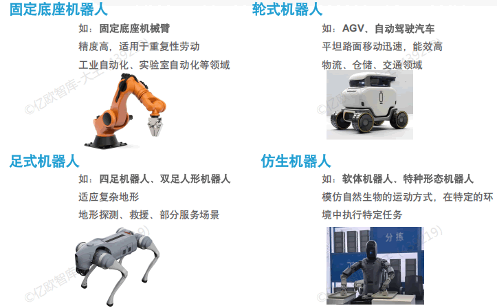 具身智能的物理载体形态丰富多样,可以将其划分为几大类别:固定底座机器人、
