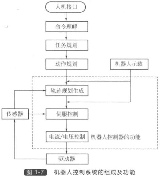 对于一个具有高度智能的机器人,它的控制系统实际上包含了“任务规划” “动作规划”“轨迹规划”和基于模型的 “伺服控制”等多个层次,如图1-7所示。 机器人先要通过人机接口获取操作者的 指令,指令的形式可以是人的自然语言, 或者是由人发出的专用的指令语言,也可 以是通过示教工具输入的示教指令,或者 键盘输入的机器人指令语言以及计算机程 序指令。机器人其次要对控制命令进行解释理解,把操作者的命令分解为机器人可以实现的 “任务”,这是任务规划。然后机器人针对各个任务进行动作分解,这是动作规划。为了实现机器人的一系列动作,应该对机器人每个关节的运动进行设计,即机器人的轨迹规划。Z底 层是关节运动的伺服控制