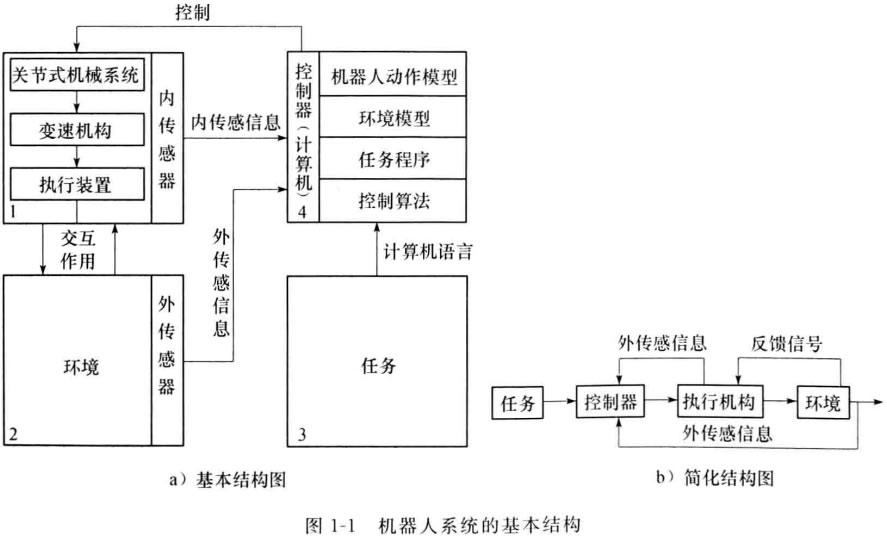 一 般情况下, 一 个机器人系统由下列四个互相作用的部分组成:机械手、环境、任务 和控制器,如图1 - 1a 所示,图1 - 16为其简化形式。