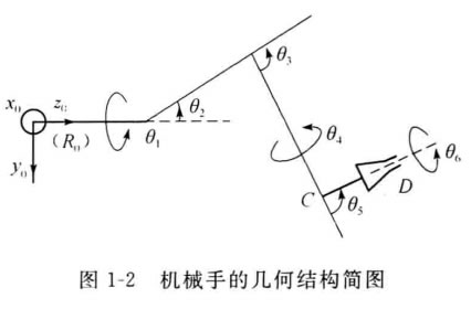 械手用于执行指定的作业任务。不同的机械手 具有不同的结构类型。图1-2给出机械手的几何 结构简图。机械手又称为操作机、机械臂或操 作手。大多数机械手是具有几个自由度的关节 式机械结构, 一般具有六个自由度。其中,头