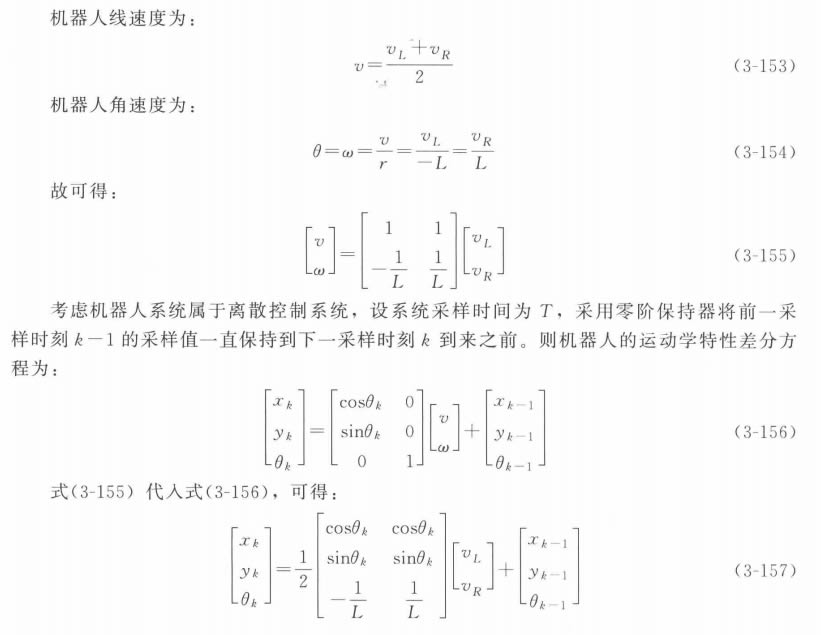 移动机器人能够直接进行控制的是两个d立驱动电机,因此采用 [vL,vR] 形式的输 入控制量,来分别控制两个驱动轮。下面讨论如何将机器人的前进速度v 和转动速度w 转 化为机器人两个轮子的线速度v₁ 和vR。
