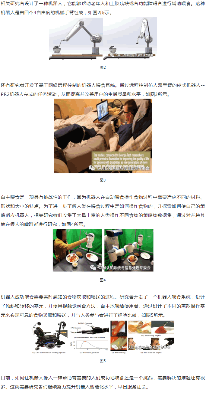 日本相关研究者开发了一款喂食机器人,名叫“My Spoon”,残疾人可以利用利用嘴巴、手或脚控制一个操作杆吃饭。机器人手臂前端装有叉和勺子,能够将食物自动夹起,并送到操作者嘴边。豆腐等软性食品则可以用勺直接舀起,饭菜送到嘴前,上层的叉子还会感应缩回,不会伤到使用者的嘴巴,靠着喂食机器,颈部以下瘫痪的病人、肢体不便的老人,也能自行进食。