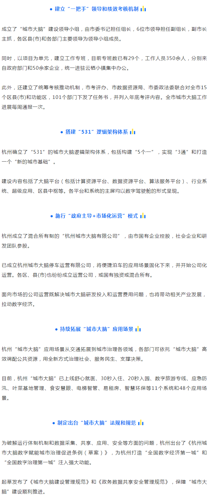 治堵取得阶段性胜利后,2018年9月和12月,杭州市推出了“城市大脑升级”版,提出构建 “以大脑中枢平台为核心,纵向到区县(市),横向到各部门”的“城市大脑”,建立了市级、部门系统、区县平台和街道平台四类数字驾驶舱,并聚焦城市治理的“痛点”“堵点”和群众反映强烈的“热点”“难点”问题,推出了11大系统和48个应用场景,“城市大脑”在城市运行的生命体征感知、公共资源配置、宏观决策指挥、事件预测预警、“城市病”治理等方面发挥了重要作用。