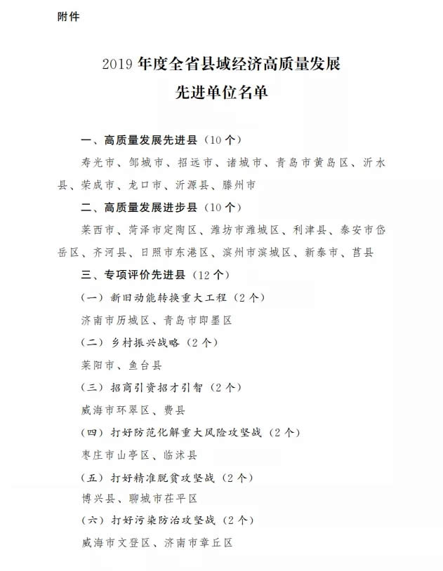 为表彰先进,进一步激发县域经济发展活力,增强县域经济发展动力,经研究决定,对2019年度10个“G质量发展先进县”、10个“G质量发展进步县”及12个“专项评价先进县”进行通报表彰。