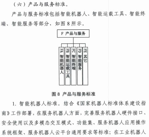 智能机器人标准:结合《国家机器人标准体系建设指 南》工作部署,在服务机器人方面,完善服务机器人硬件接口、 安全使用以及多模态交互模式、功能集、服务机器人应用操作 系统框架、服务机器人云平台通用要求等标准;在工业机器人