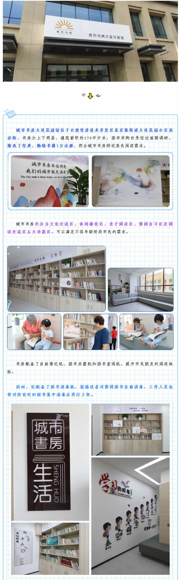 城市书房万达广场馆位于日照万达广场二楼,总面积280平方米,拥有图书10000册,设有阅览桌椅45个,配有自助办证服务终端、自助借还服务终端、图书杀菌机、自沉式还书箱、查询一体机等服务设备,方便读者进行阅读