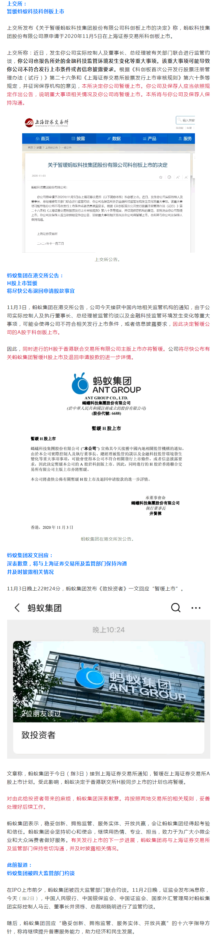 港交所也发布公告称,暂缓蚂蚁集团H股上市,并表示将尽快公布有关蚂蚁集团暂缓H股上市及退回申请股款的进一步详情