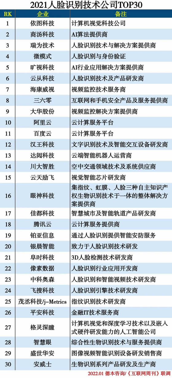 佳都科技,数梦工厂,四维图新,海纳云,明略科技,商汤科技,大华股份,京东数科,清明星辰,云天励飞,永洪科技,艾云科技,云从科技,眼神科技