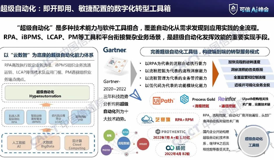 超级自动化已经成为企业即开即用、敏捷配置的数字化转型工具箱。经过一年多的发展,超级自动化有了很多新的价值。在概念深化方面,中国信息通信研究院在今年发布的《超级自动化技术与应用研究报告(2022)》中首次对其主要概念进行了深入剖析和理解,认为“超级自动化是多种技术能力与软件工具组合,覆盖了自动化从需求发现到应用实践的全流程”;在技术发展方面,机器人流程自动化、智能流程管理、低代码应用平台、流程挖掘等工具和平台,衔接起了企业级各类复杂业务场景,其综合应用、交互使能是超级自动化发挥效能的重要手段。人工智能、大数据、云计算等技术作为底座,为超级自动化发展注入了源源不断的强大动力;在应用拓展方面,政府和企业使用超级自动化技术开始呈现出多面爆发的状态。例如,日本多面引入RPA实现政务的数字化转型,据统计各级政府的引入率已经超过90%。同时,产业创新层面,L先的RPA企业都不再局限于RPA或流程挖掘等单点能力的输出,而是围绕信通院提出的超级自动化技术与工具体系,开始由点及面的建立起立体服务架构。