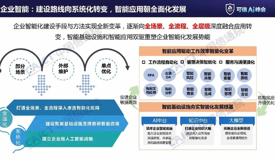 企业智能化建设手段与方法实现全新变革,逐渐向全场景、全流程、全层级深度融合应用转变。随着智能化技术的不断发展和应用深入,企业智能建设从部分场景、外部维护、单点优化逐渐向系统化、多面化转变,通过智能基础设施和智能应用双驱重塑企业智能化发展势能。