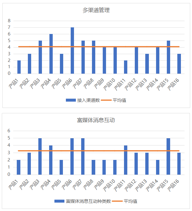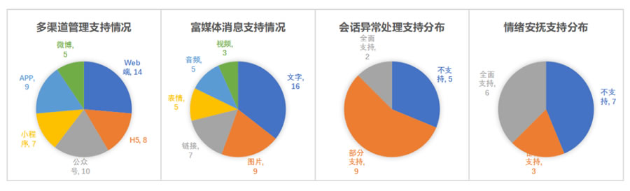 总体而言,参评产品在多渠道管理支持能力和富媒体消息互动支持能力方面表现良好,所有参评产品均支持两种及其以上渠道管理,G的支持达到六种,多面覆盖了PC端和移动端用户。参评产品在会话异常处理上表现比较接近,大部分产品部分支持该功能,在情绪安抚功能支持上两J化差异较明显,多面支持和不支持数量相近,两者合计数量占比超过八成。主要有以下三个方面的特点: