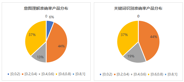 通过图3中的性能指标产品分布情况可知,多数参评产品意图理解和关键词识别准确率分布在[0.2,0.4)和[0.6,0.8),反映出参评产品在性能上的两级分化,建议相关企业及时丰富疫情相关语料并进行产品优化,提升问题解决率。