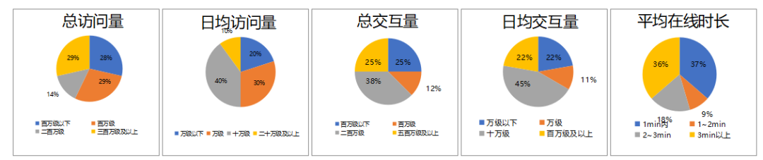 从访问量上看,超七成产品的总访问量达到了百万级,其中总访问量超过二百万和三百万的产品约占三成;从日均访问量上看,约70%的产品日均访问量在一万到二十万之间,仅有10%的产品突破了二十万大关;从交互量上看,约75%的产品总交互量超过了百万条,约78%的产品日均交互量超过一万条;从用户平均在线时长上来看,超五成产品达到了2分钟以上,约37%的产品用户平均在线时长不足1分钟,另外平均在线时长超过3分钟的产品数约占36%。