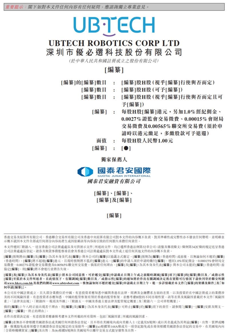 附件:人形机器人D一股「优必选科技」,递交招股书,拟香港IPO上市