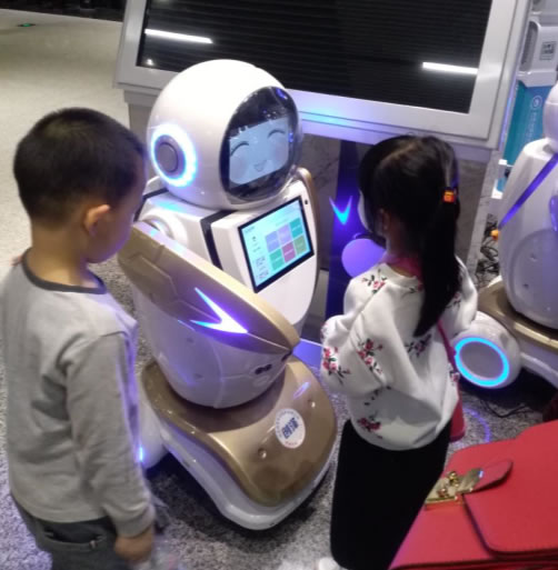 智能对话机器人正在和小朋友对话互动呢,这是对话互动现场,小朋友和机器人都很认真呢...