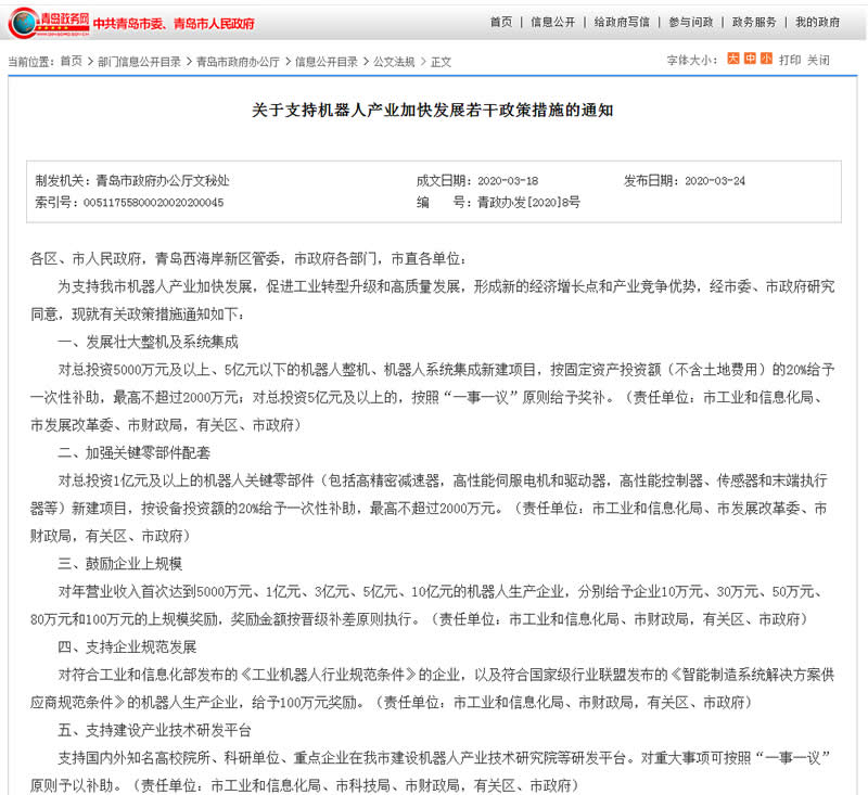 2020年3月18日,青岛市政府办公厅印发《关于支持机器人产业加快发展若干政策措施的通知》,出台支持机器人产业发展的6大方面10条措施。这是山东省内出台的D一个机器人产业政策,其政策优惠力度在全国J具竞争力。其中,在引进培育机器人整机及系统集成企业、鼓励产品研发等方面,该政策创新力度实现新突破。
